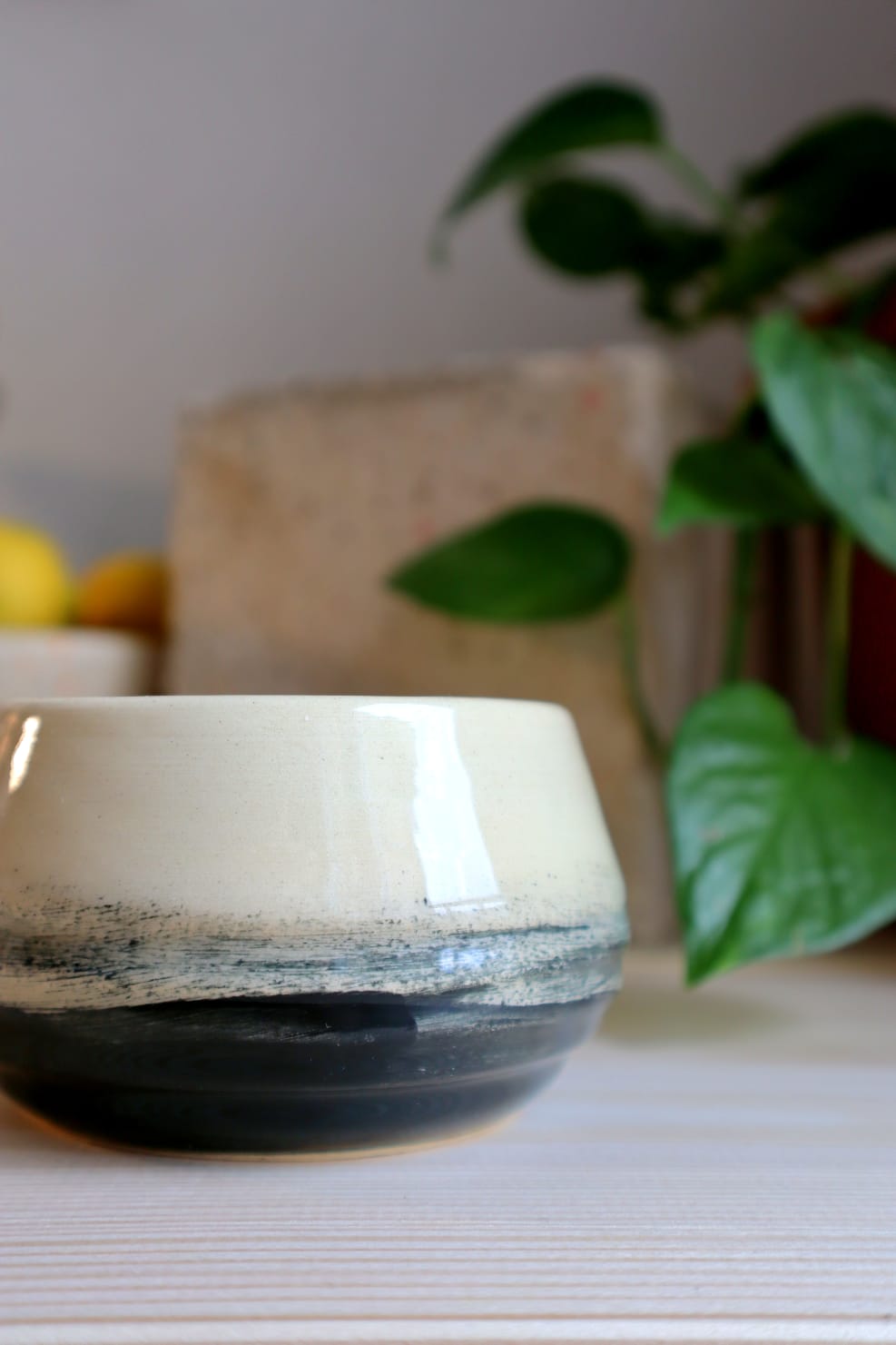 This ceramic piece was handcrafted on a pottery wheel.